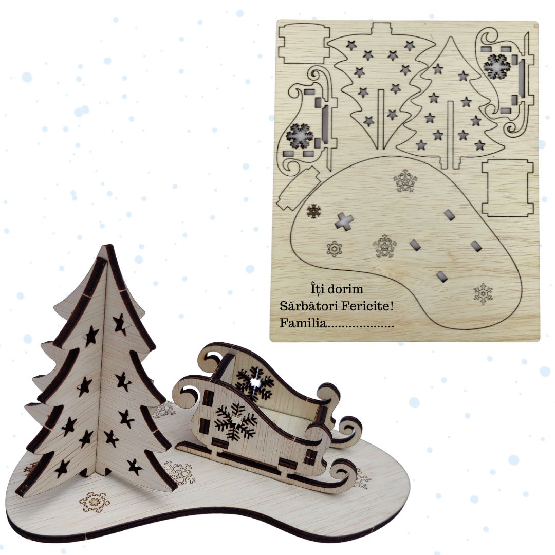 Setul de plansa tip puzzle, compus dintr-un bradulet si o saniuta este un cadou ideal atat pentru copii cat si pentru adulti.