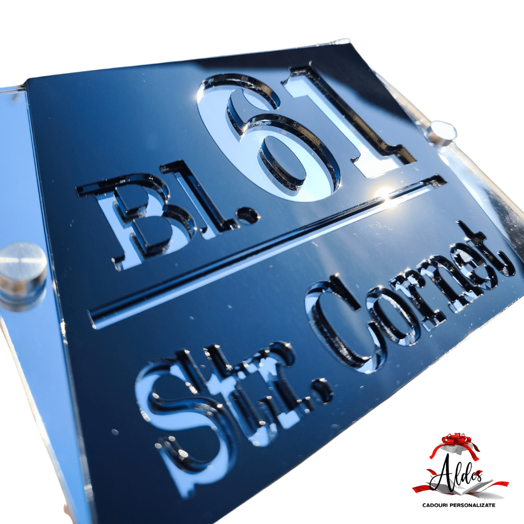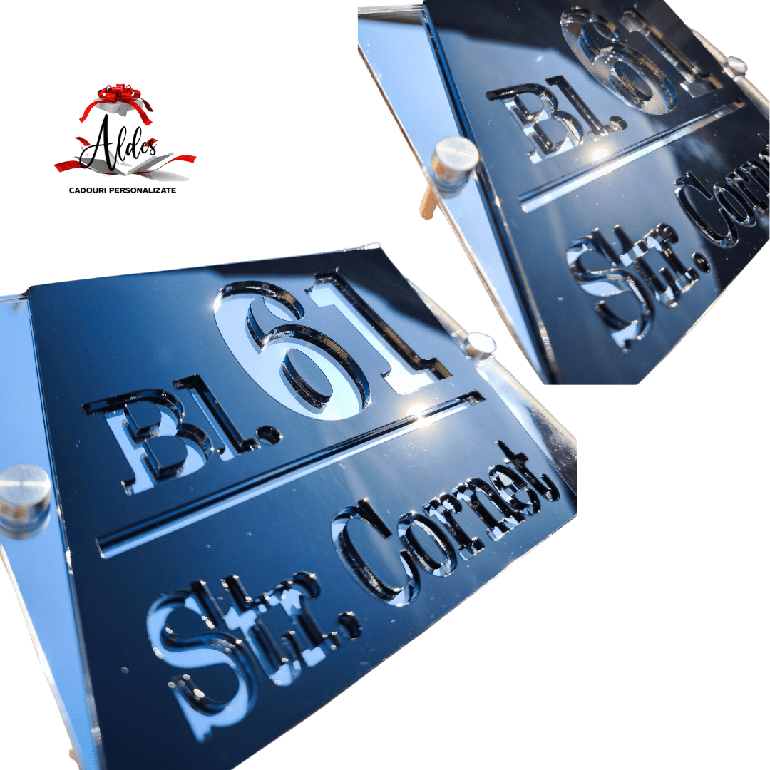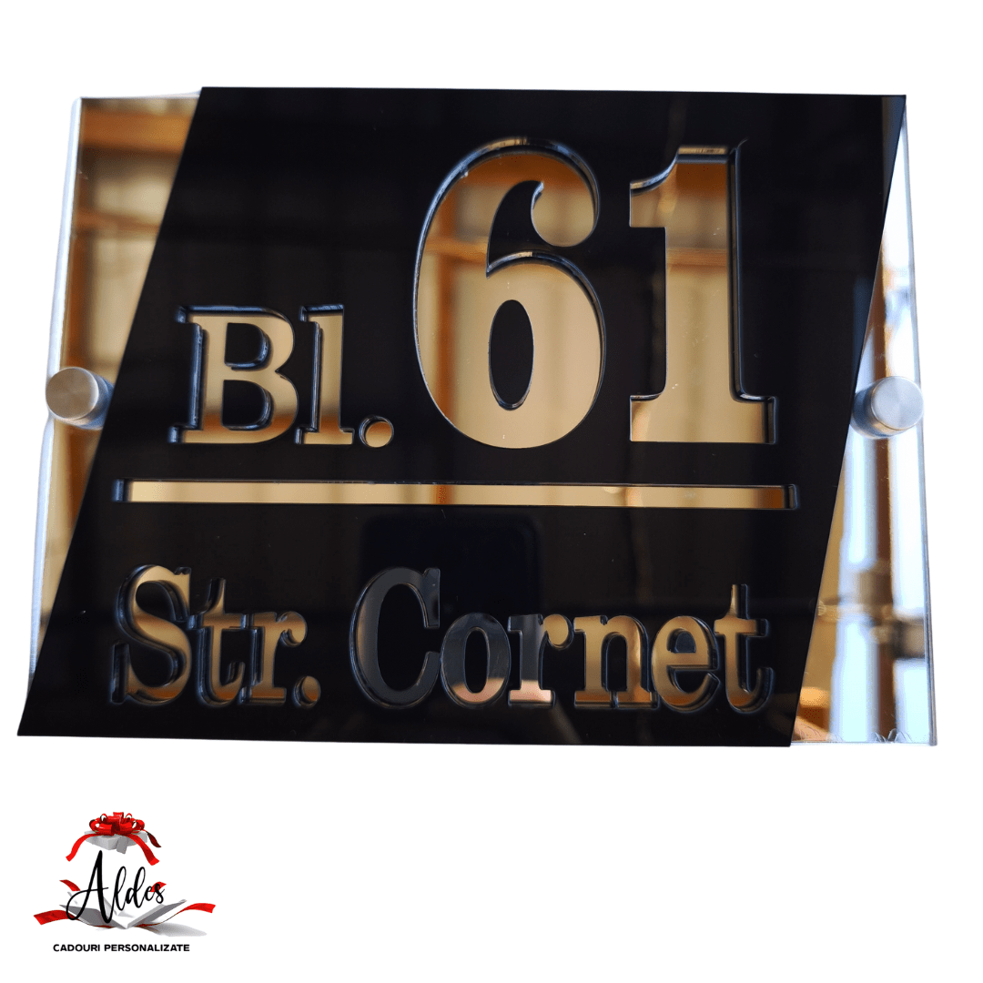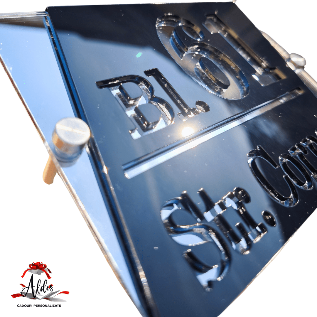 Placa cu numarul blocului si numele strazii. Acestea sunt realizate din plexiglas (PMMA) colorat si plexiglas oglinda aurie sau argintie.
