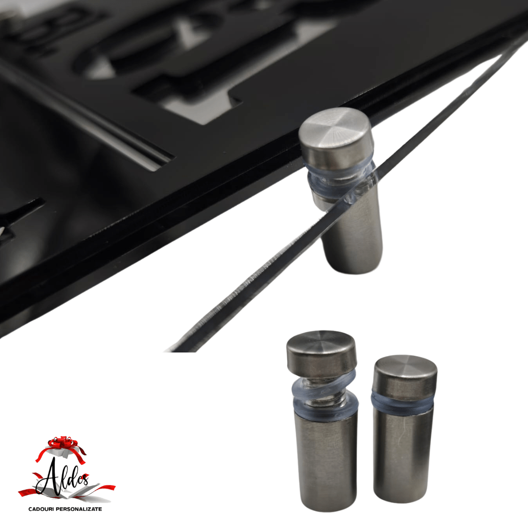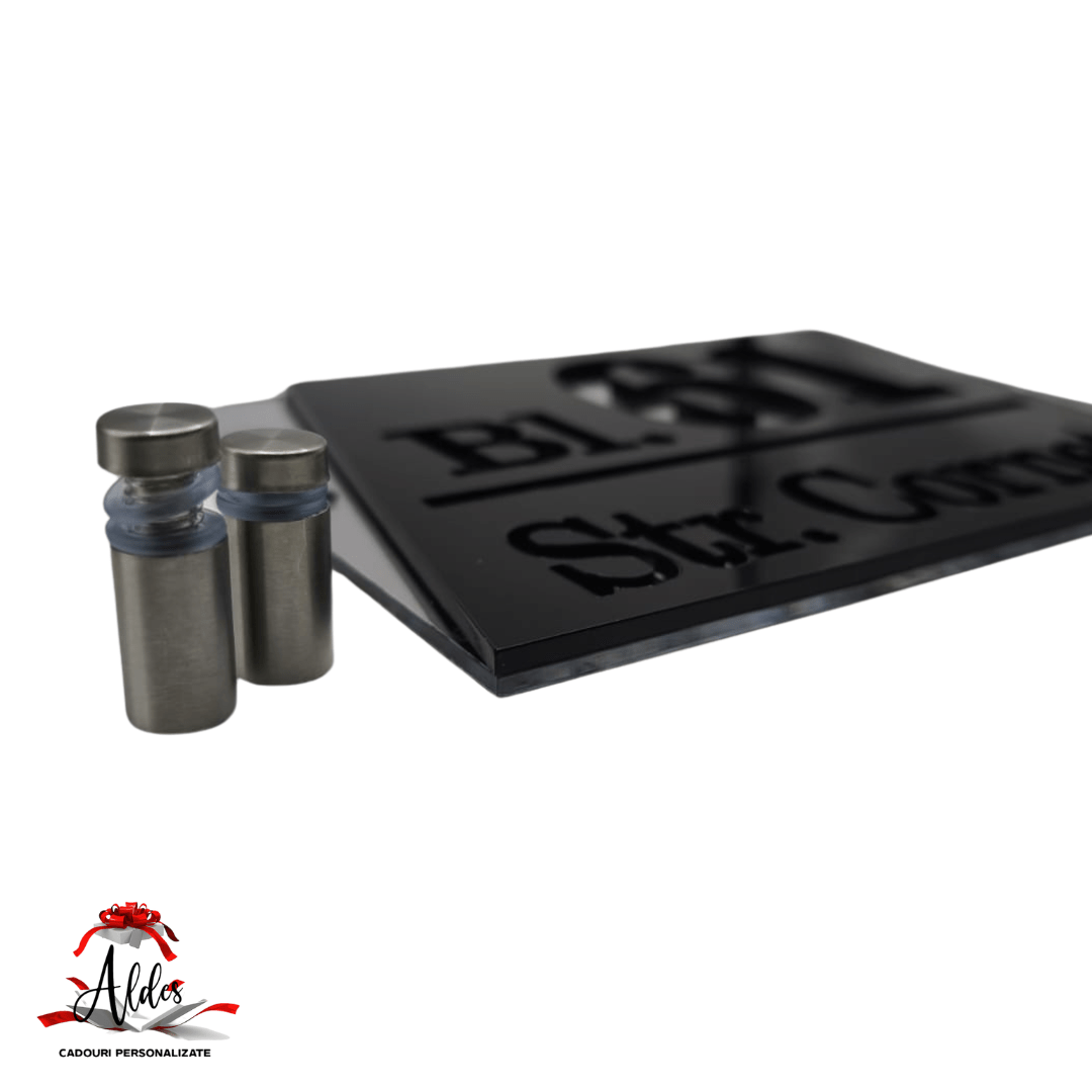 Placa „nume strada si numar bloc” cu suport de prindere in perete / usa de tip bolt-uri metalice.