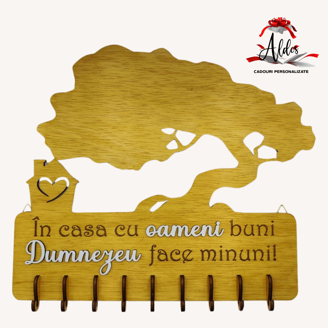 Suportul de chei este realizat din lemn de plop. Scrisul este gravat iar cuvintele "oameni" si "Dumnezeu" sunt aplicate/lipite din mdf Alb.