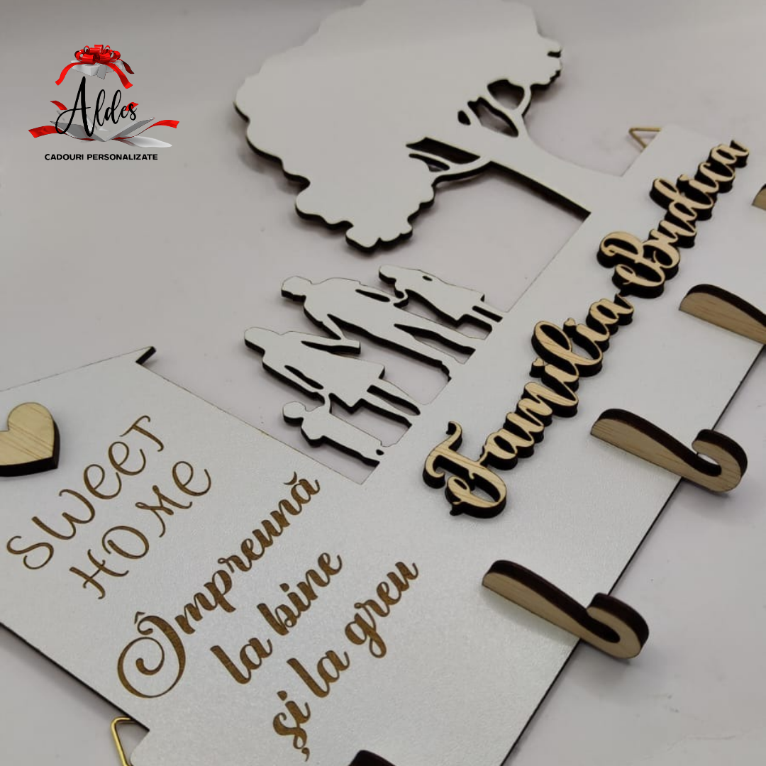 Suportul de chei este realizat din MDF. Suprafata este vopsita manual. Numele este fixat prin lipire iar scrisul / mesajul este gravat pe suprafata de MDF.