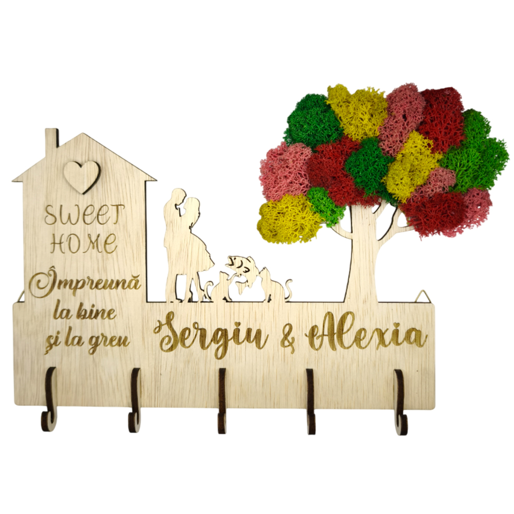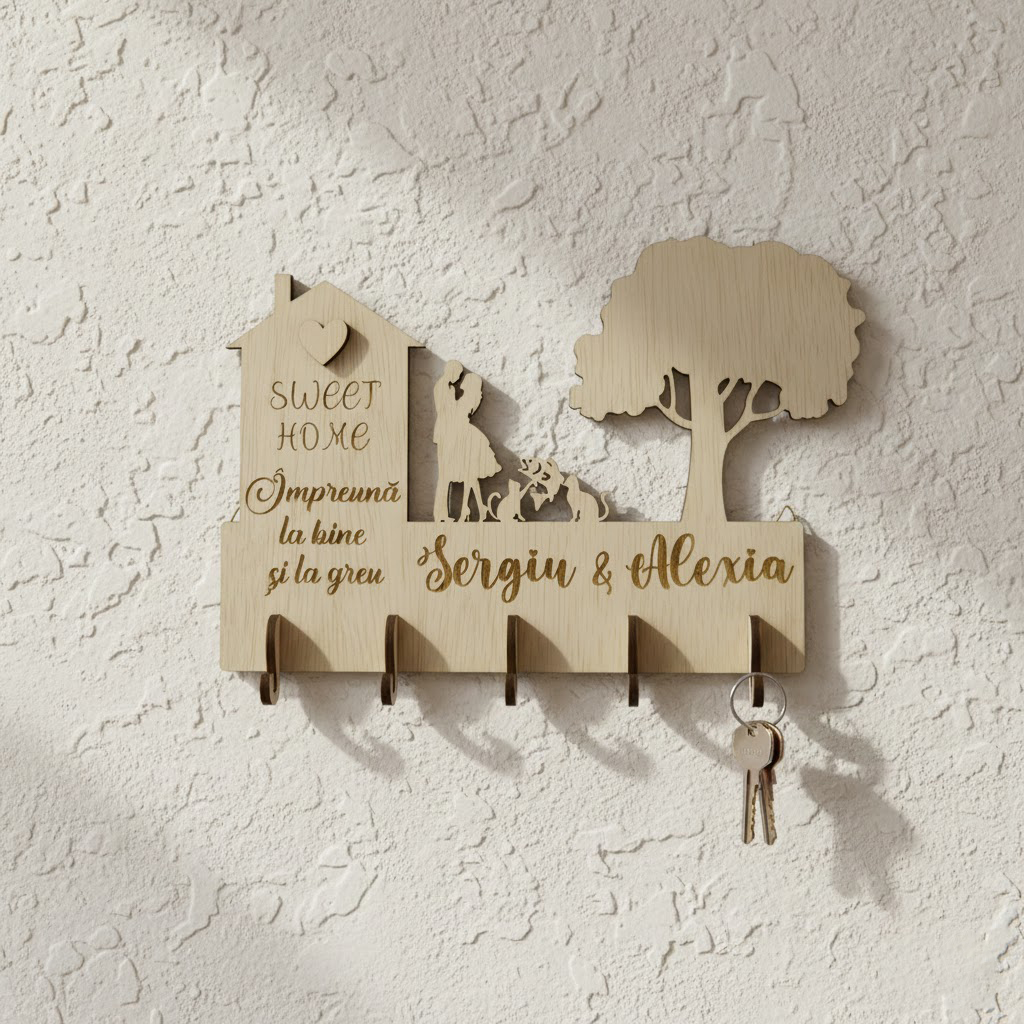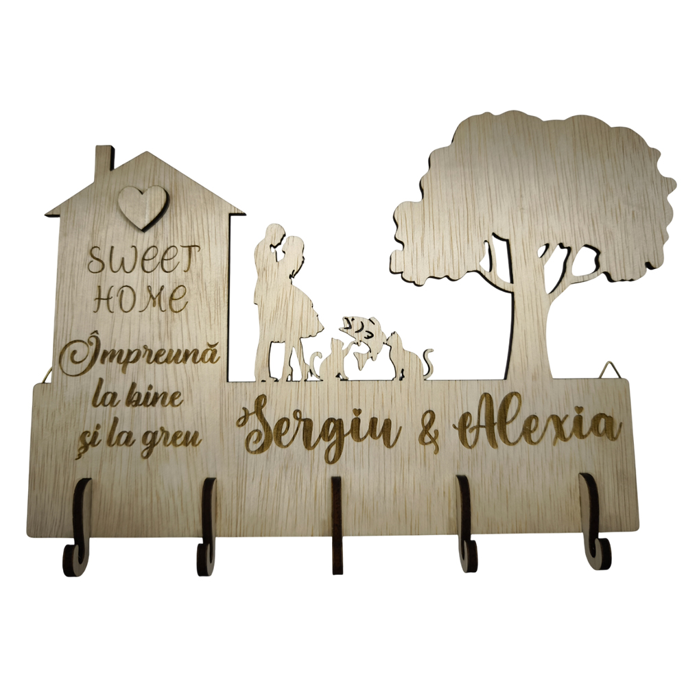 Continut pachet: 1 buc decoratiune suport chei gata asamblata, 2 buc agatatori perete (pe spate).