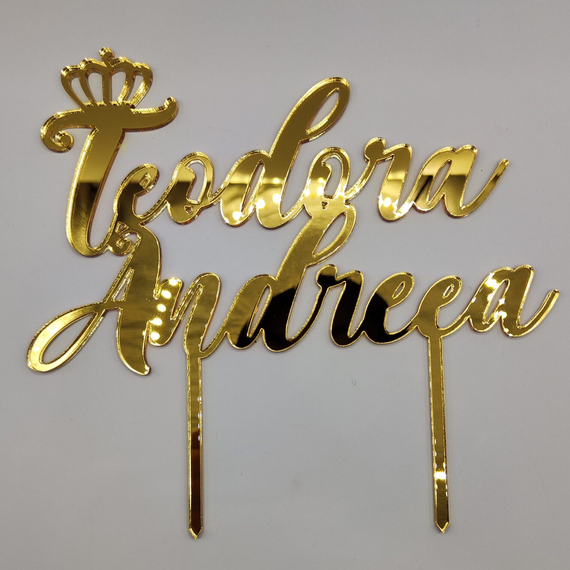 Toppere tip doua nume suprapuse cu coronita, scrise cu litere de mana. Ideal pentru decorarea si personalizarea torturilor, a buchetelor de flori sau orice alt articol care se doreste a fi personalizat.