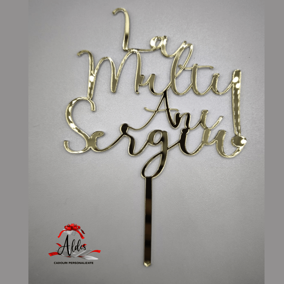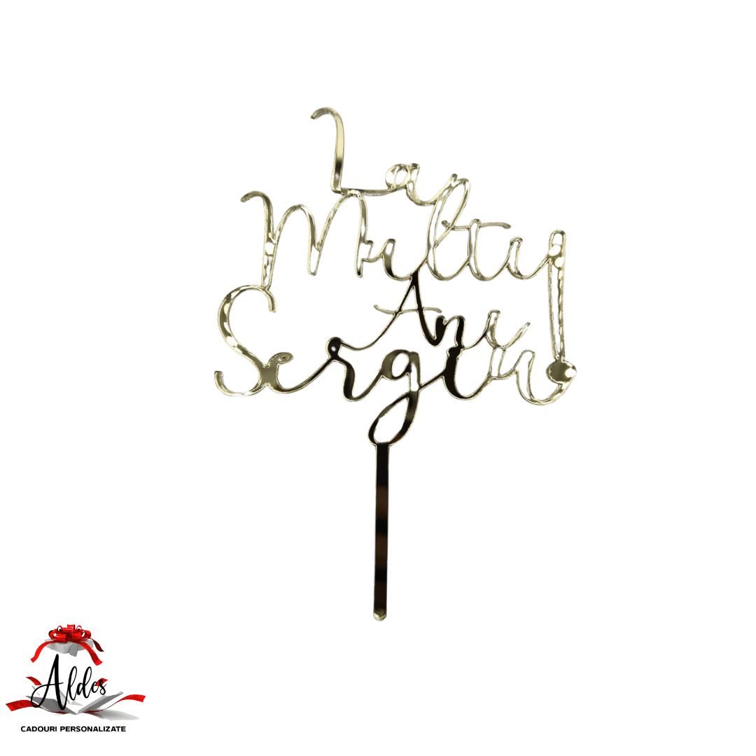 Toppere "La multi ani si nume personalizat", scrise cu litere caligrafice. Ideal pentru decorarea si personalizarea torturilor, a buchetelor de flori sau orice alt articol care se doreste a fi personalizat.