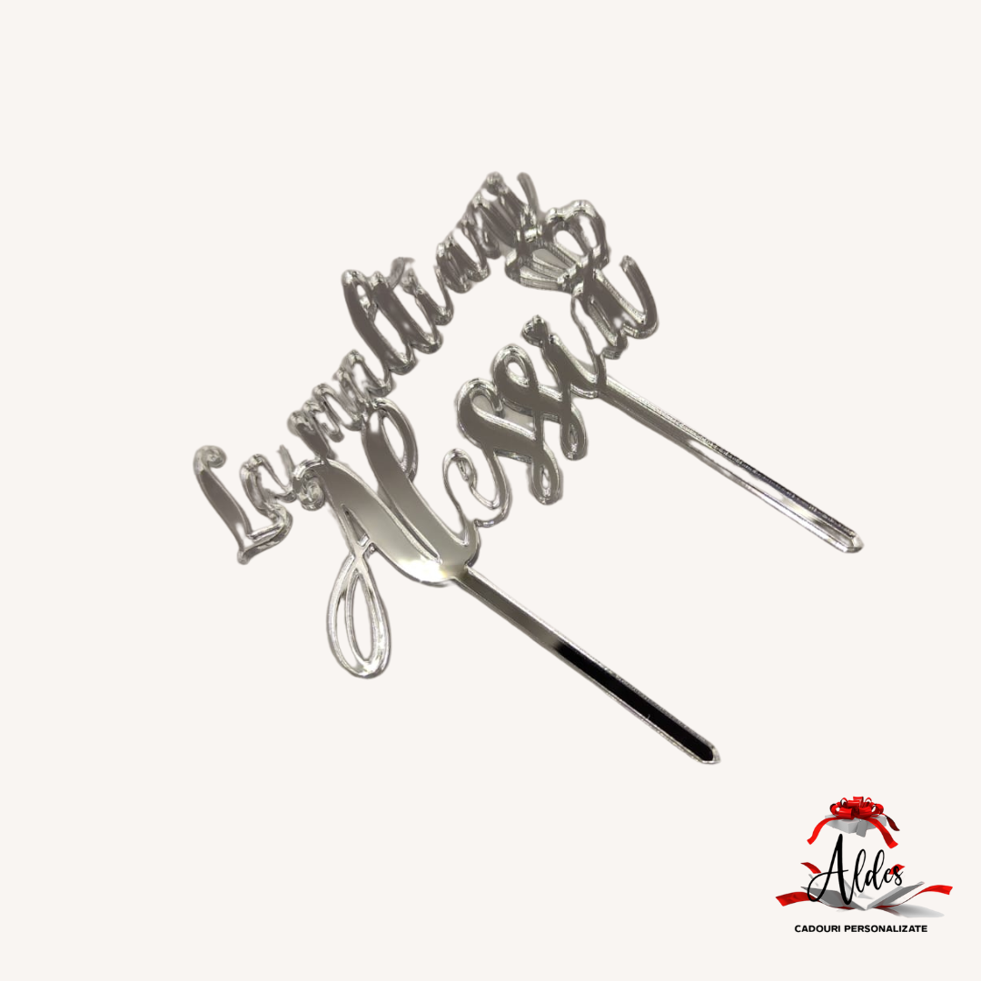 Topper „La multi ani cu nume personalizat”, cu suport, din plexiglas (acril) oglinda