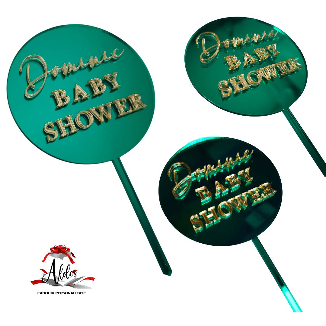 Topper personalizat „Baby shower””, cu suport, din plexiglas (acril) oglindă colorată. Literele sunt realizate din oglindă aurie si sunt lipite pe baza rotundă din oglindă colorată la alegere.