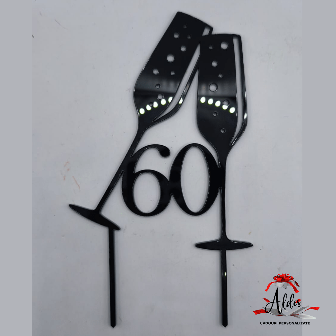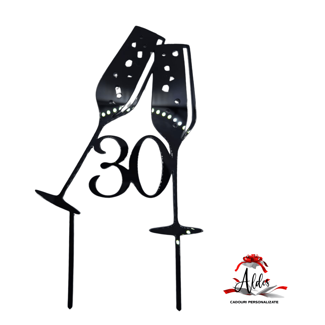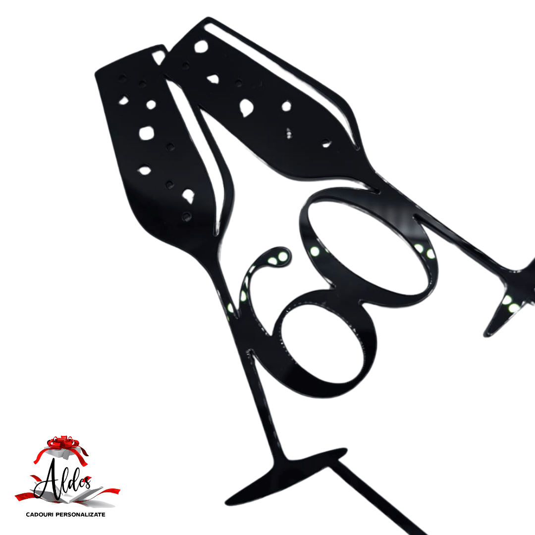 Toppere alcatuit din 2 pahare de sampanie si numar aniversar pentru decorarea si personalizarea torturilor, a buchetelor de flori sau orice alt articol care se doreste a fi personalizat.